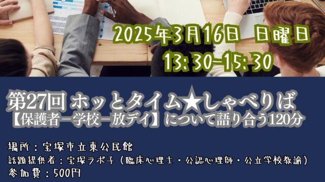 ホッとタイム★しゃべりば 【募集開始】第27回ホッとタイム★しゃべりば【保護者ー学校ー放デイ】について語り合う120分 2025年2月21日 宝塚ラボ子 【発達支援・ひきこもり支援・地域支援】宝塚発達心理ラボ 第27回ホッとタイム★しゃべりば 【保護者ー学校ー放デイ】について語り合う120分 ★少人数でアットホームに語り合い …