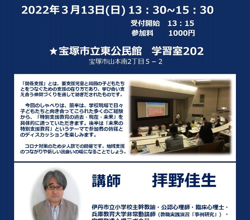 ホッとタイム★しゃべりば 【活動報告】「特別支援教育の現在・過去・未来」 2022年3月21日 宝塚ラボ子 【発達支援・ひきこもり支援・地域支援】宝塚発達心理ラボ 2022年3月13日(日)に行われたホッとタイム☆しゃべりば「特別支援教育の現在・過去・未来」の報告です。 色々なご意見が出ました …