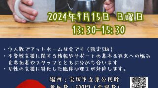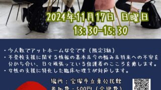 平日はメンバーはそれぞれに仕事がありますので、月に一度、休日を利用して地域に向けた学習会や催しをしています。主に発達支援・ひきこもり支援の内容が多く、ひきこもり女子会はひきこもり支援活動のひとつです。