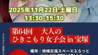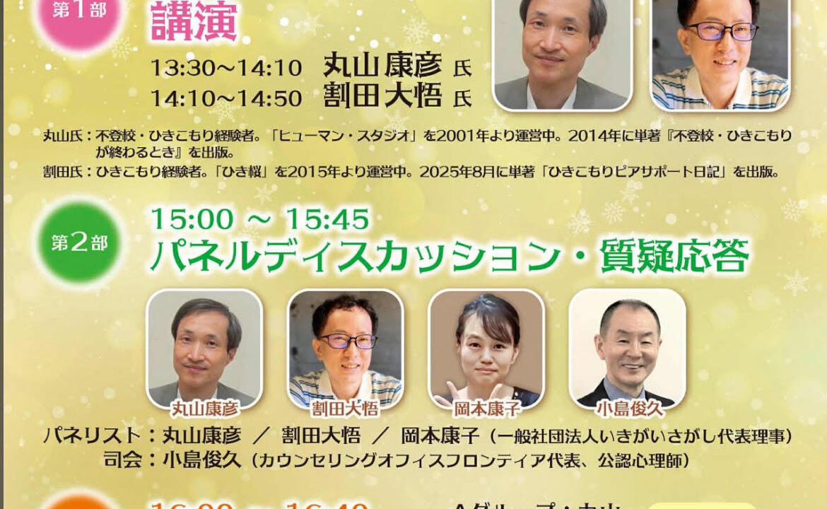 情報提供 情報提供:【兵庫ひきこもり相談支援センター阪神ブランチ地域相談会】ひきこもりを生きる~本人も家族も孤立しないために~ 宝塚ラボ子 2025年11月24日 ラボの12月の活動ではこちらの催しを全面的に応援しています👇みなさまのご参加お待ちしています。会場でお会いいたしましょう♪ AD/HD ASD HSP HSP~ひといちばい繊細な人~ アセスメント いじめ ことば つまづき ひきこもり ひきこもり女子会 大人のひきこもり女子会 宝塚 宝塚発達心理ラボ 心理